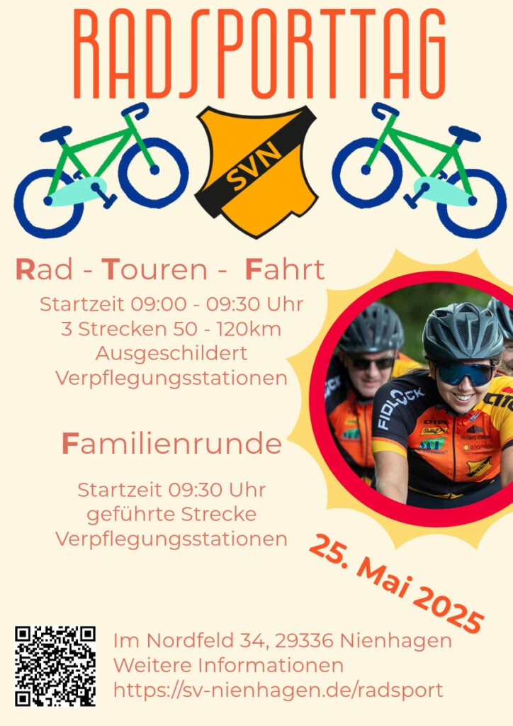Du liebst das Radfahren und suchst eine sportliche Herausforderung oder einfach eine schöne gemeinsame Tour mit der Familie? Dann komm zu unserem Rad-Sport-Tag beim SV Nienhagen!