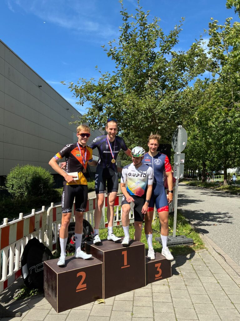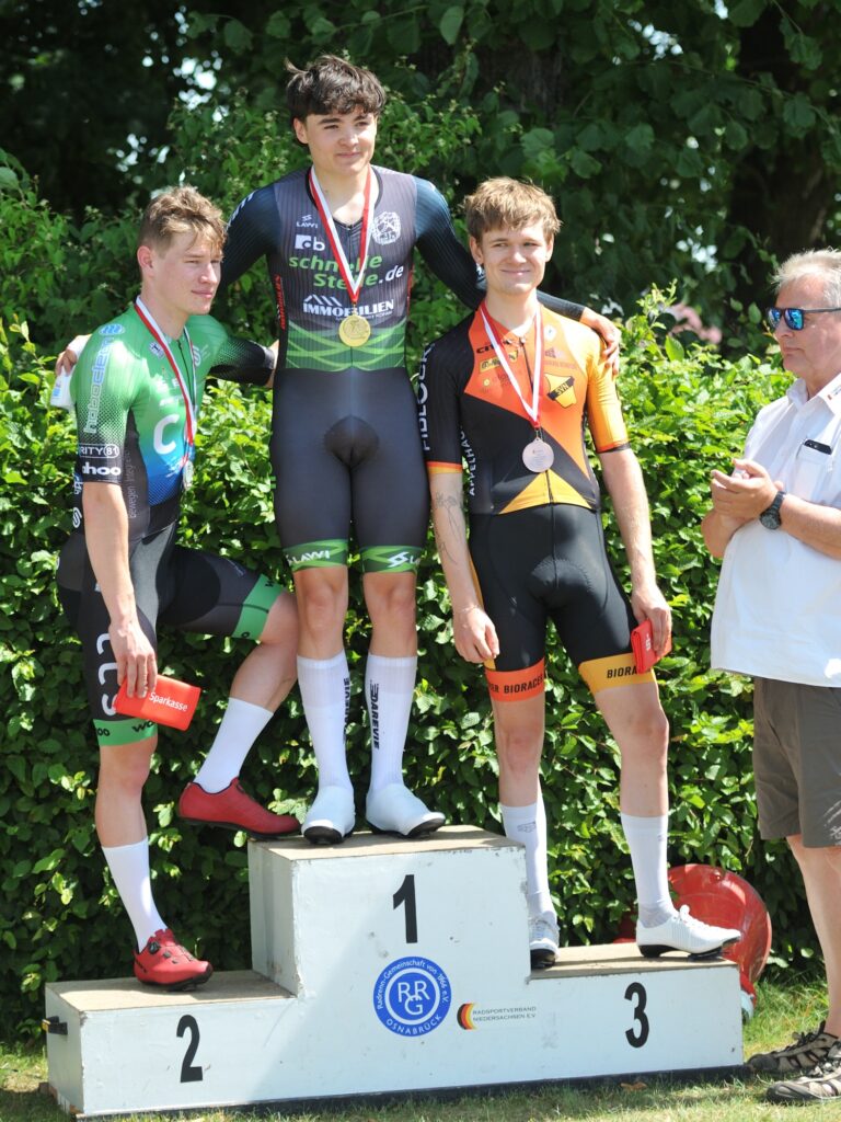 Am vorletzten Juli Wochenende fanden die Niedersächsischen Meisterschaften im Einzelzeitfahren statt. Bei dieser Disziplin handelt es sich um die Spezialdisziplin von Nicklas Janowitz und er fuhr auch mit Titelambitionen bei den U23 nach Osnabrück. Leider waren seine Beine nicht so gut an diesem Tag und er musste sich nach 20 km und einem 45er Schnitt mit Platz drei begnügen. Eigentlich eine super Leistung, aber eine Woche vor der Deutschen Meisterschaft war Nicklas nicht mit dem Ergebnis zufrieden.