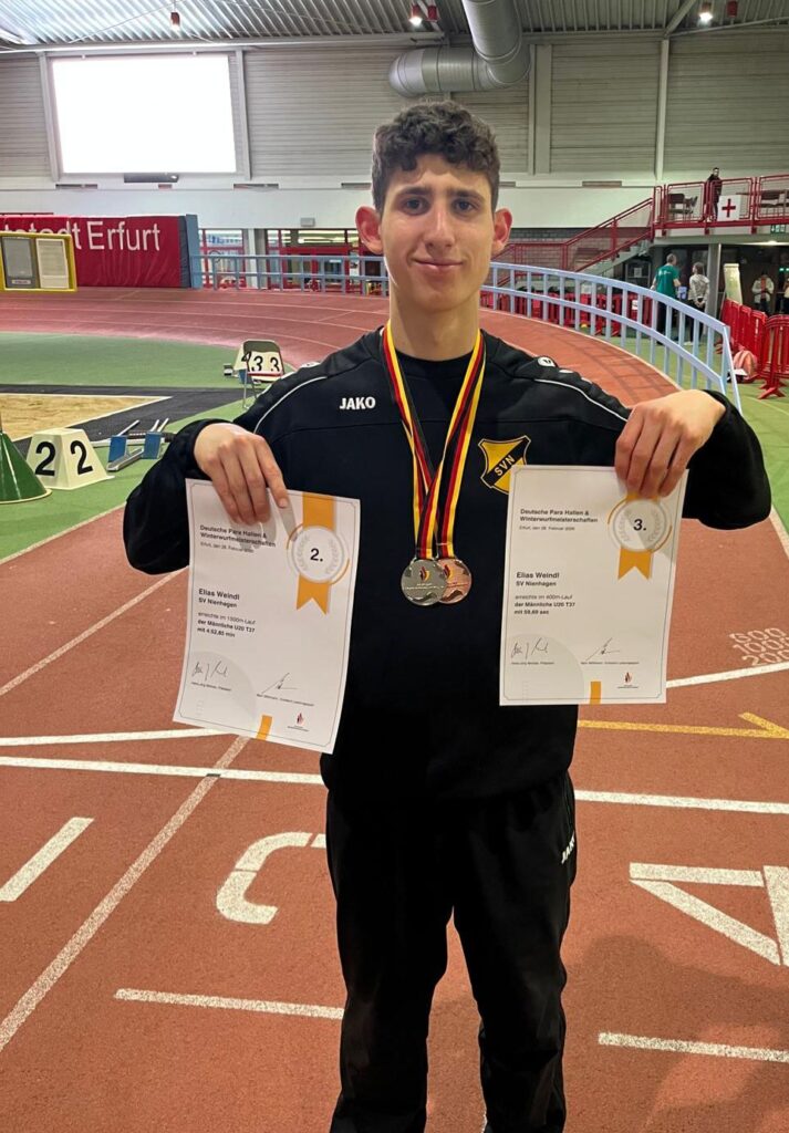 Elias Weindl erlebte bei den Deutschen Hallenmeisterschaften in Erfurt einen Wettkampftag, den er so schnell nicht vergessen wird. Nach einem starken 400‑m‑Lauf in 59,69 Sekunden und Platz drei stand er nur eine Stunde später erneut an der Startlinie. Was folgte, war ein beeindruckender 1500‑m‑Lauf, in dem er seine persönliche Bestzeit um 29 Sekunden pulverisierte. Mit 4:52,85 Minuten krönte er sich zum Deutschen Vizemeister.