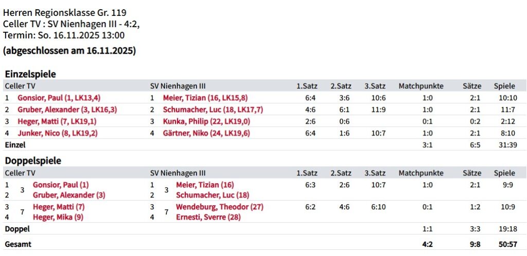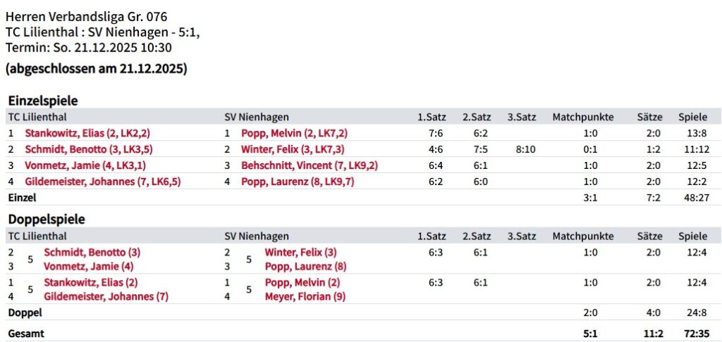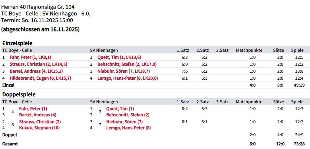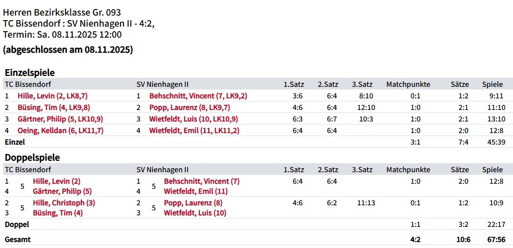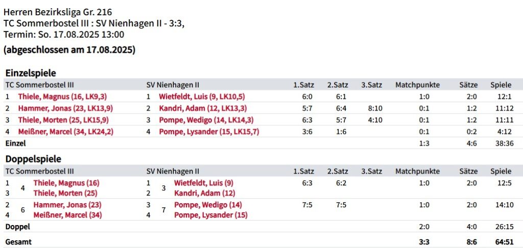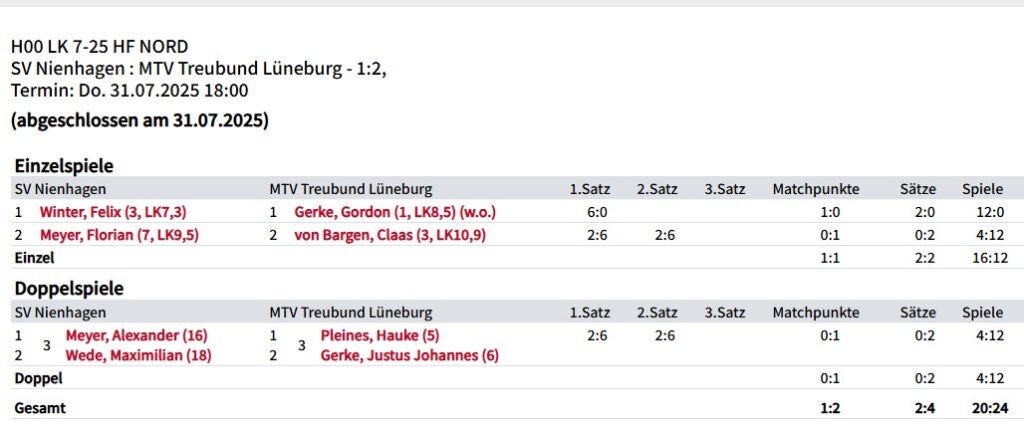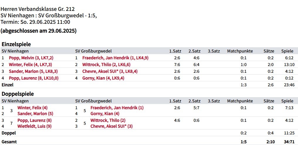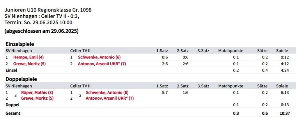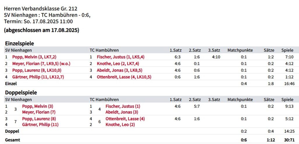 Nichts zu holen gab es im Derby gegen Hambühren was auch zeitgleich den Abstieg aus der Verbandsklasse bedeutet. Einzig Melvin Popp wehrte sich mit variablem Spiel gegen Justus Fischer, allerdings reichte es im Matchtiebreak dann nicht mehr und so musste er sich mit 6:3, 1:6 und 4:10 geschlagen geben. Über die restlichen Spiele wird der Mantel des Schweigens gelegt.