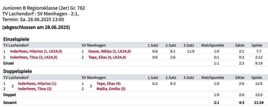 Das war am Ende nix, man ging bei der Doppelaufstellung auf volles Risiko und stand am Ende mit leeren Händen da. Melvin brauchte einen Satz um auf Temperaturen zu kommen, aber dann bot er seinem Gegner aber einen echten Fight und unterlag mit 0:6, 4:6. Felix Winter machte seinen Job solide und gewann mit 6:1, 6:4. Marlon Sander fand nie richtig in die Partie und verlor 3:6, 3:6. Laurenz macht es wie sein Bruder und kam nur langsam auf Touren, brachte aber ein 6:4, 6:1 mit nach Hause. Im Doppel unterlagen dann Felix und Flo mit 2:6, 3:6, während Melvin und Laurenz überraschend deutlich 3:6, 2:6 unterlagen.