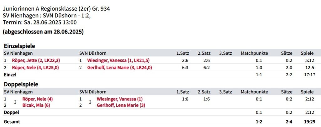 Nichts wurde es mit einem gelungenen Saisonabschluss, Jette Röper musste sich einer starken Gegnerin mit 3:6, 2:6 geschlagen geben. Nele Röper drehte das Ergebnis genau um und gewann mit 6:3, 6:2. Im Doppel waren Nele und Mia dann ohne realistische Siegchance beim 1:6, 1:6.