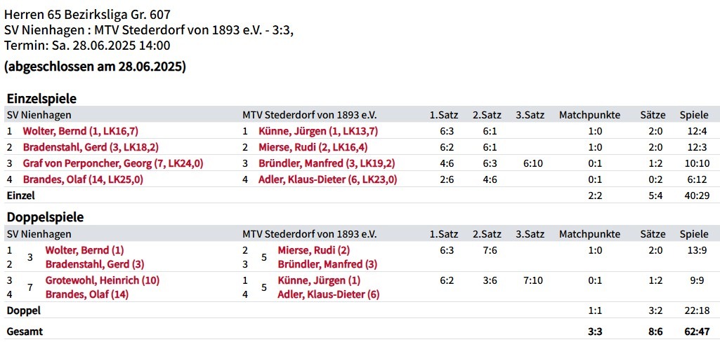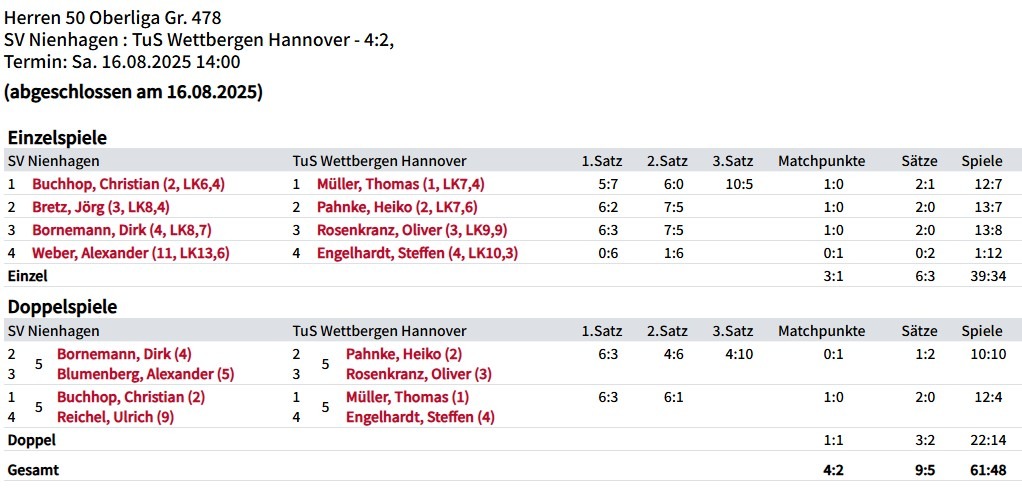 Herren 60 des SV Nienhagen verteidigen nach 4:2 Sieg die Tabellenführung !