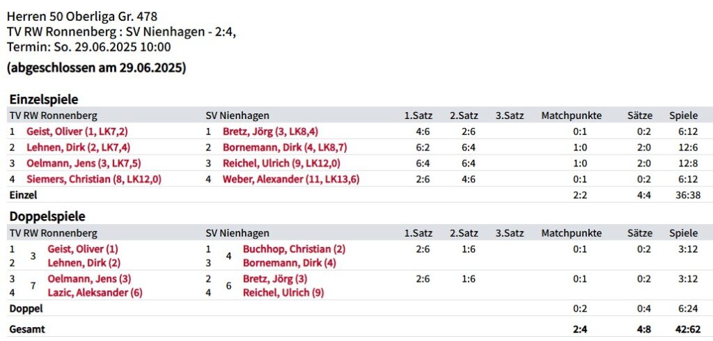 Ausgeschieden im Halbfinale sind dagegen die Herren 50 ohne eine realistische Siegchance. In Mörse unterlag man glatt mit 0:3. Christian Gutsche hielt bei seinem 4:6, 2:6 gut mit, zu mehr reichte es am Ende nicht. Christian Schoof unterlag 2:6, 0:6 und Christian Buchhop sowie Alexander Weber unterlagen 4:6, 4:6.