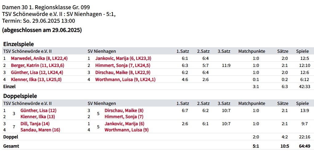 Das nächste Punktspiel findet am 04.06.23 gegen den TC TSV Burgdorf II in Nienhagen statt.