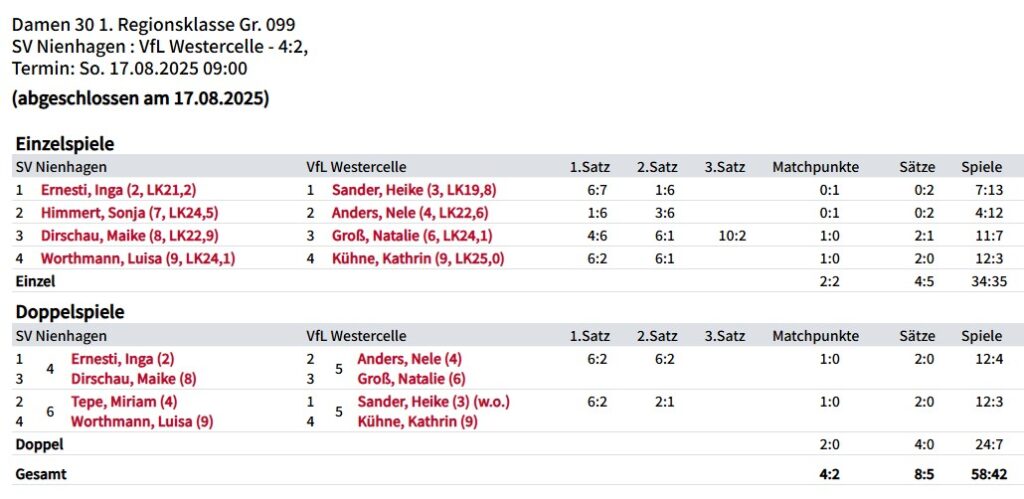 Im letzten Spiel des Sommers gelang den Damen 30 nochmal eine kleine Überraschung und ein verdienter Sieg gegen Westercelle. Inga Ernesti kämpfte mit Heike Sander alleine im ersten Satz 90 Minuten lang, bevor sie diesen dann mit 6:7 verlor und das Match danach komplett an ihr vorbei lief. Sonja Himmert kämpfte tapfer gegen ihre starke Gegnerin, musste sich aber mit 1:6, 3:6 geschlagen geben. Maike Dirschau fand schwer in Spiel, überzeugte ab Satz 2 aber mit einem 4:6, 6:1 und 10:2. Luisa Worthmann zog ihr Spiel durch und siegte mit 6:2, 6:1. In den Doppel sollte man sich dann für die Trainingsleistungen belohnen und gewann beide Doppel (Inga und Maike 6:2, 6:2 sowie Miriam und Luisa mit 6:2, 2:1). Dadurch konnte man die rote Laterne am letzten Spieltag noch an MTV Eintracht abgeben.