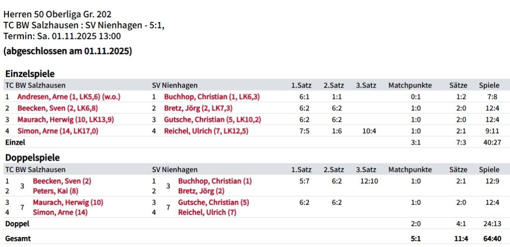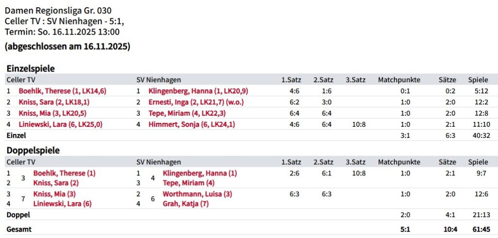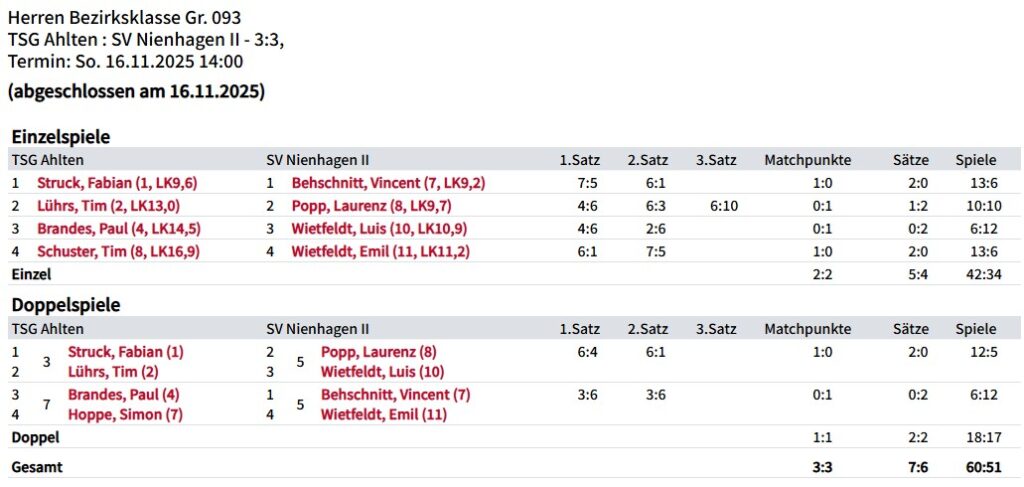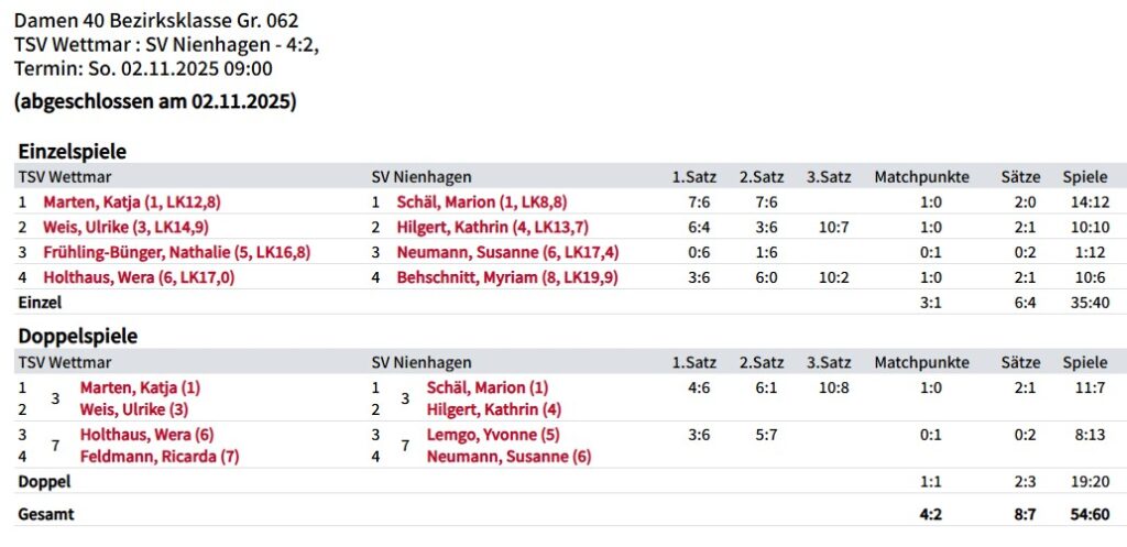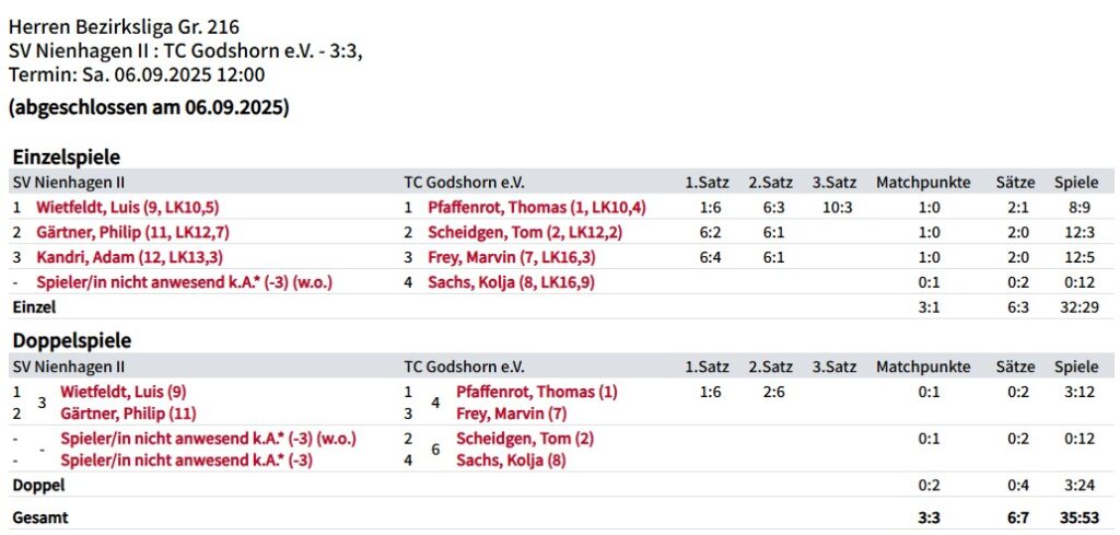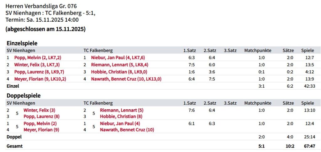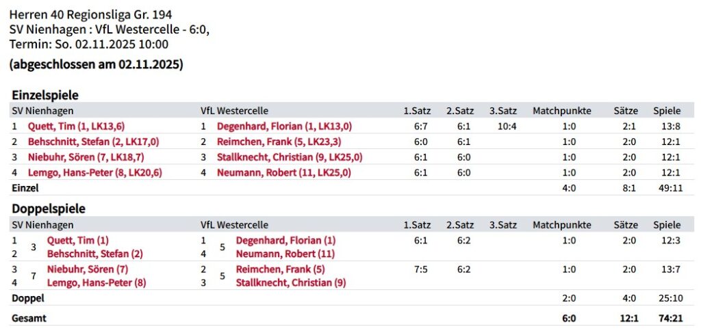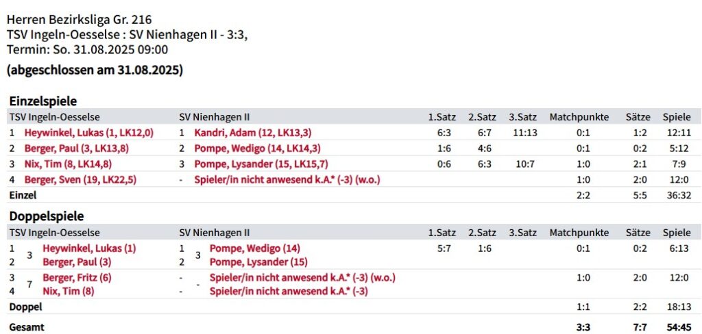 Damit war das Spiel bereits nach den Einzeln für den SVN entschieden, so dass die beiden Niederlagen im Doppel nur Ergebniskosmetik war. Am 4.6. geht es mit einem Heimspiel gegen den Tabellenzweiten Wiepenkathen weiter.