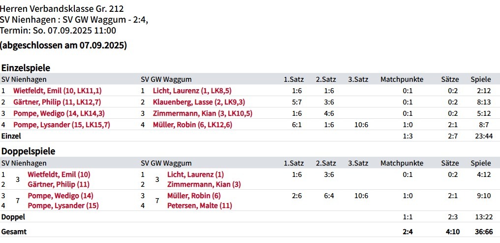 Achtbar schlugen sich die Youngster im letzten Spiel gegen mit Waggum mit einer 2:4 Niederlage. Emil Wietfeldt verlor mit 1:6, 1:6. Philipp Gärtner unterlag mit 5:7, 3:6. Wedigo Pompe unterlag mit 1:6, 4:6 seinem Gegner. Lysander Pompe sorgte für den Hoffnungsschimmer, durch sein 6:1, 1:6 und 10:6. Im Doppel siegten die Brüder Pompe mit 2:6, 6:4 und 10:6. Leider unterlagen Emil und Philipp deutlich mit 1:6, 3:6.