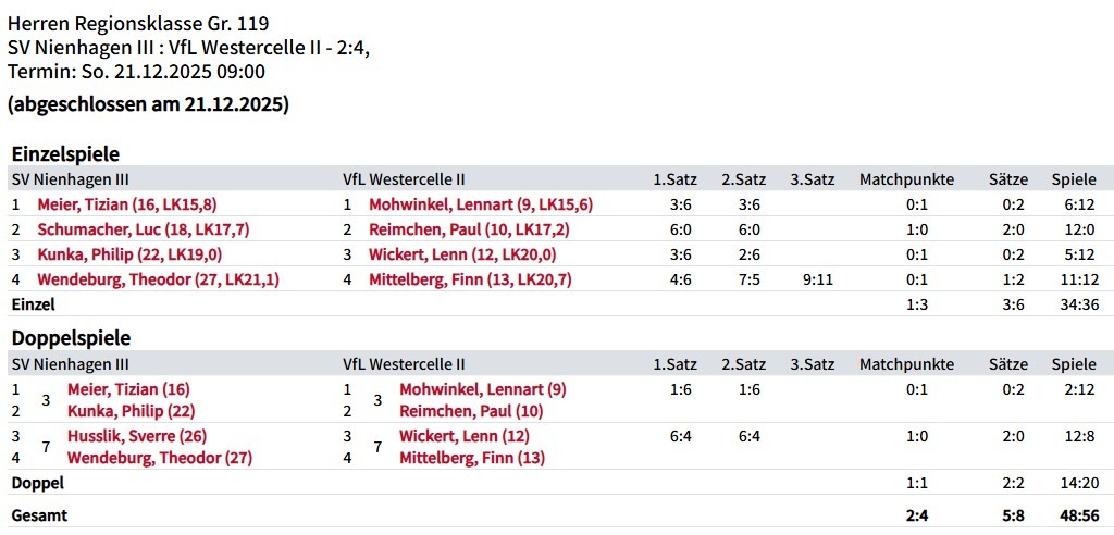 Ein Unentschieden war möglich, am Ende musste man sich mit einer 2:4 Niederlage zufrieden geben. Tizian Meier unterlag nach gutem Spiel mit 3:6, 3:6. Luc Schumacher begeisterte mit einem glatten 6:0, 6:0. Philip Kunka verlor überraschend deutlich mit 3:6, 2:6 und Theodor Wendeburg musste sich dramatisch mit 4:6, 7:5 und 9:11 geschlagen geben. Im Doppel wurden die Punkte dann geteilt, Meier / Kunka verloren während Husslik und Wendeburg gewannen.